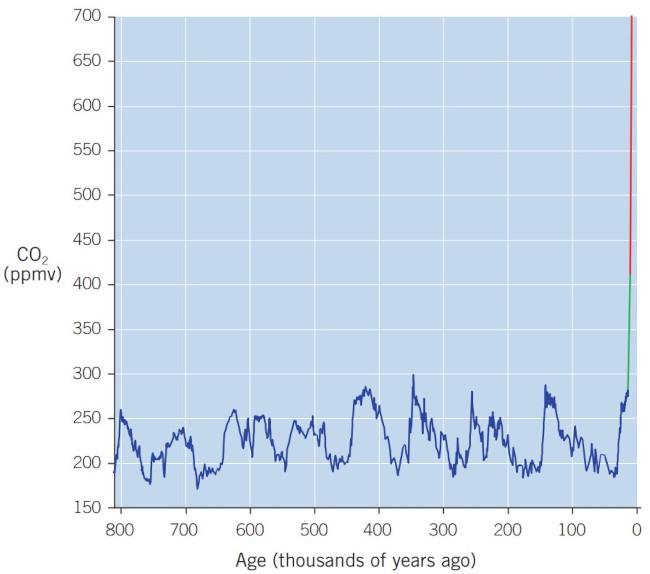 CO2 concentration in the atmosphere in parts per million by volume (ppmv) for the last 800,000 years and up to the pre-industrial era (data measured in Antarctic ice cores are shown in blue; data from Lüthi et al. [2008]), in the last few centuries and up to the present (shown in green, as measured in ice cores and instruments; data from The Keeling Curve project, Scripps Institution of Oceanography, University of San Diego, California), and in future projections up to the end of the twenty-first century, according to intermediate emissions scenarios (shown in red).