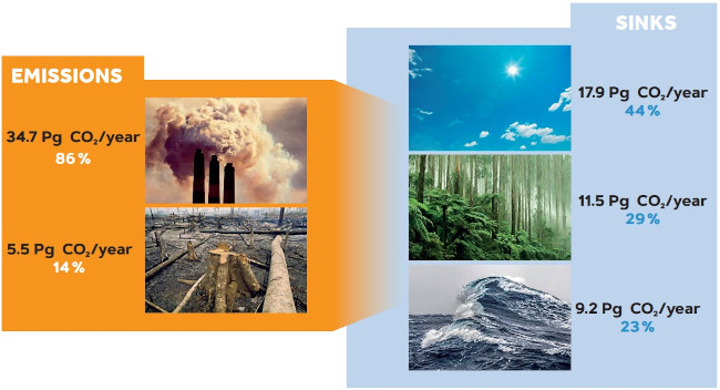 Fundamentally, the CO. that humans release into the atmosphere is distributed into three major compartments: atmosphere, continents, and oceans (Figure 2). During the 2009–2018 period, it was estimated that 44 % of CO. emissions went into the atmosphere, 29 % went into the continents (fixed by plants), and 23 % was absorbed by the seas and oceans, with the remaining 4 % representing the current mismatch between the calculation of global emissions and sinks (Friedlingstein et al., 2019). These calculations are independent and, because of their inherent uncertainties, emissions and sinks often do not match perfectly. A positive mismatch, as in this case, either means that emissions are being overestimated, or that sink estimates are lower than the actual values. We should be grateful, therefore, that not all the CO. that humans release by burning of fossil fuels remains in the atmosphere and, most importantly, that it can be absorbed by plants and ocean waters. Were it not so, the concentration of CO. in the atmosphere would be significantly higher, thereby aggravating the greenhouse effect and global warming. However, as we will discuss below, the CO. absorbed by the oceans affects a number of chemical balances and results in gradual ocean acidification, which conditions the development of many marine organisms.