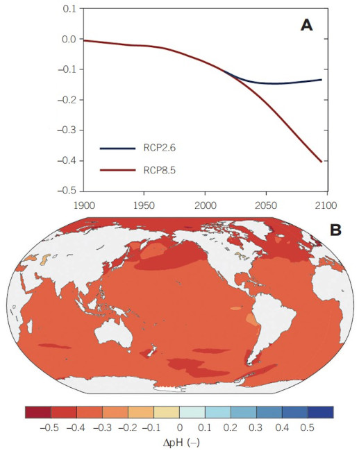 A) Simulation of past and future changes in global oceanic surface water pH according to optimistic (RCP2.6) and pessimistic (RCP8.5) scenarios. B) Changes in the surface pH of the oceans by the end of the twenty-first century in relation to the 1850–1900 period, according to a pessimistic scenario (RCP8.5). See Fuss et al. (2014) for more information on Representative Concentration Pathways (RCP) emission scenarios.