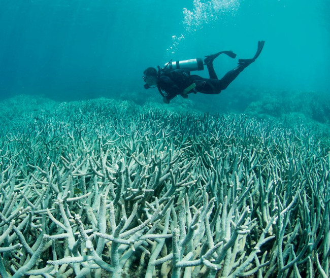 Acidification, caused by the dissolution of carbon dioxide in water, represents an additional stress on corals and other organisms that build calcium carbonate structures, because they are less able to regenerate after a bleaching process such as the one shown in the picture, taken in Australia’s Great Barrier Reef.