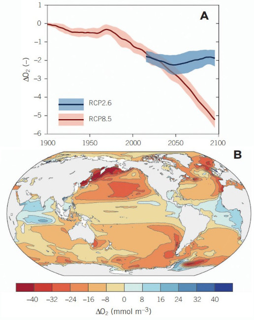 A) Simulation of past and future changes in the average dissolved oxygen concentration in the water column between 100 and 600 m depth, according to optimistic (RCP2.6) and pessimistic scenarios (RCP8.5). B) Spatial changes in the average dissolved oxygen concentration in the water column between 100 and 600 m depth by the end of the twenty-first century in relation to the 1850–1900, period according to a pessimistic scenario (RCP8.5). See Fuss et al. (2014) for more information on RCP emission scenarios.