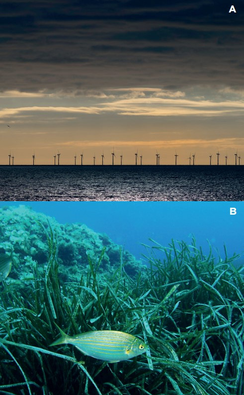 The oceans can play an important role agents in the mitigation and reduction of carbon dioxide emissions, either as potential generators of renewable energy or through carbon sequestration. A) An offshore wind farm in the United Kingdom. B) Offshore forests, such as the Posidonia oceanica meadows shown in the image, are effective carbon sinks.