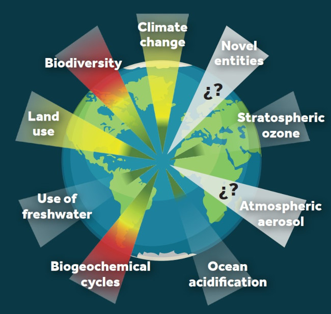 Current state of the nine environmental boundaries, a concept that evaluates the threat of different planetary issues. The threats shown in red have already exceeded the area of uncertainty and so, represent a high risk. Threats shown in yellow are currently in the area of uncertainty and so their risk is growing. Threats that are currently below the established limit are shown in green. Lastly, threats shown in grey (new forms of existing substances and atmospheric aerosols) have unquantified boundaries.