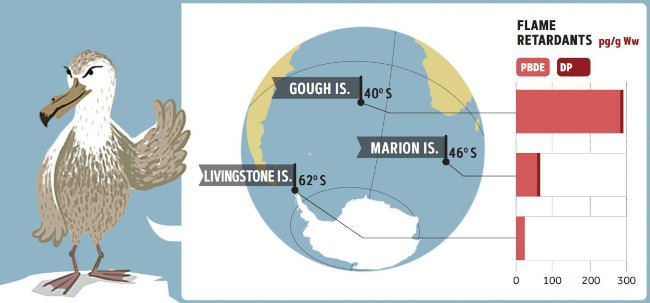 The presence of flame retardants (polybrominated diphenyl ethers or PBDEs and Dechlorane Plus or DP) in giant petrel populations (Macronectes spp.) in the South Atlantic Ocean, South Indian Ocean, and Antarctica (Roscales et al., 2016). These retardants are very persistent in nature and are also widely used in mobile phones, tablets, and computers, and so the correct disposal and recycling of obsolete devices is essential to prevent the dispersal of these pollutants in very remote areas such as the Antarctic seas.