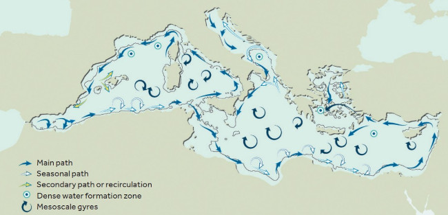 General circulation in the Mediterranean originates from the differences in density between the different water masses. It is structured in three layers (surface, intermediate, and deep) and shows a cyclonic pattern around the western and eastern sub-basins.