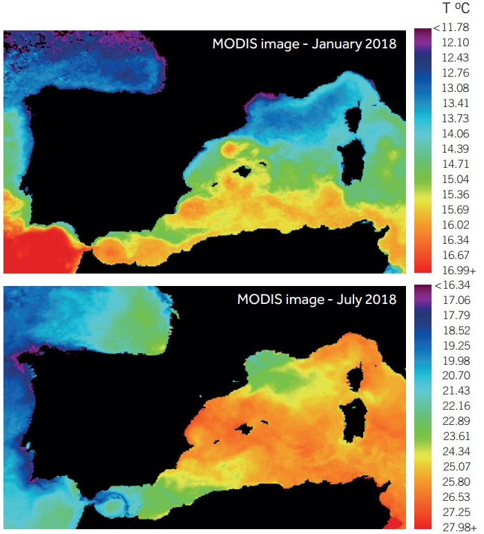In winter, a north-south latitudinal gradient (~4 °C) was observed between the coldest waters in the northern basin and the warmest ones in the Alboran basin. In summer, the spatial temperature variability was greater (~9 °C) and there was a high degree of warming in the central basins. The image shows the area analysed.