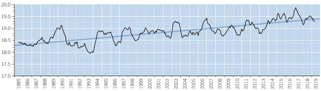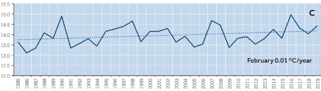 Evolution of sea surface temperature in the Ligurian-Provençal, Balearic, Algerian, and Alboran basins for the period 1985–2019, from thermal images from the NOAA and MODIS satellites. The average heating rate was 0.03 °C/year.