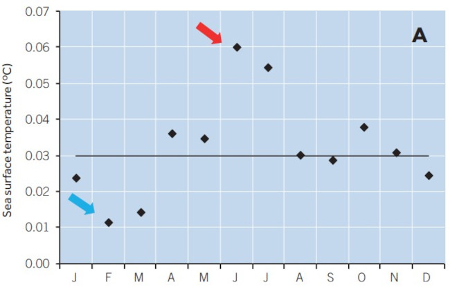 The lowest values occured in winter (February and March) and the highest ones were recorded in spring-summer (June and July). The horizontal line marks the average annual rate (0.03 °C/year). All the trends were significant (with p-values ranging from < 0.0001 to 0.034) except for February, which was not statistically significant.
