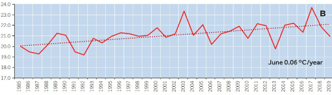The variations in the seasonal curve can be seen more clearly in Figure 5, which shows the average seasonal curves calculated for the periods 1985–1999 and 2000–2019, together with the monthly temperature increases between both periods in absolute values. In the first decade (1985–1999), the 24 ℃ average was only exceeded in August, while in recent decades (2000–2019) this occurred in three months (July, August, and September), with monthly averages close to 27 ℃ recorded in August 2003 and 2018. These results show that the summer season started earlier and was more intense, with average temperature increases in spring–summer (~1 ℃) and autumn (~0.7 ℃) over the last two decades.