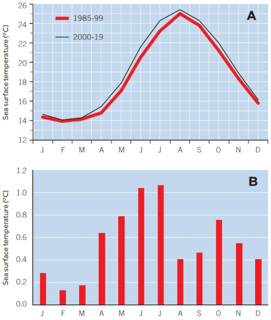 A) Average seasonal curves of the surface temperature of the Mediterranean for the periods 1985–1999 and 2000–2019. B) Temperature increase per month between both periods. The changes in the seasonal curve show that the summer season was starting earlier and becoming longer, with temperature increases of 1 °C during the summer and 0.5 °C in the autumn between both periods.