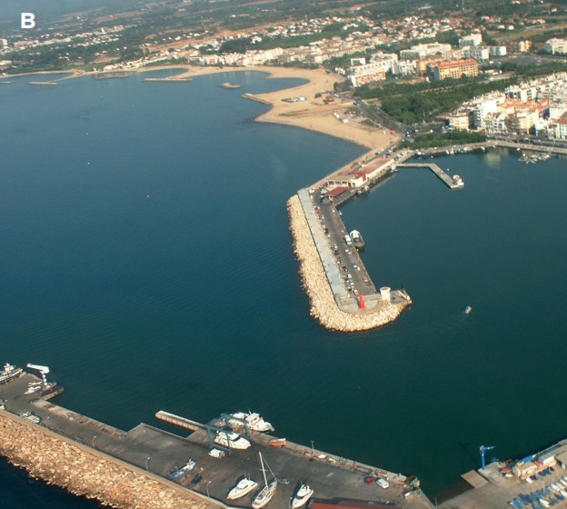 B) Harbour and beach in Cambrils, Tarragona (Spain). Building harbours and breakwaters increases the volume of confined waters, an ideal habitat for dinoflagellate blooms.
