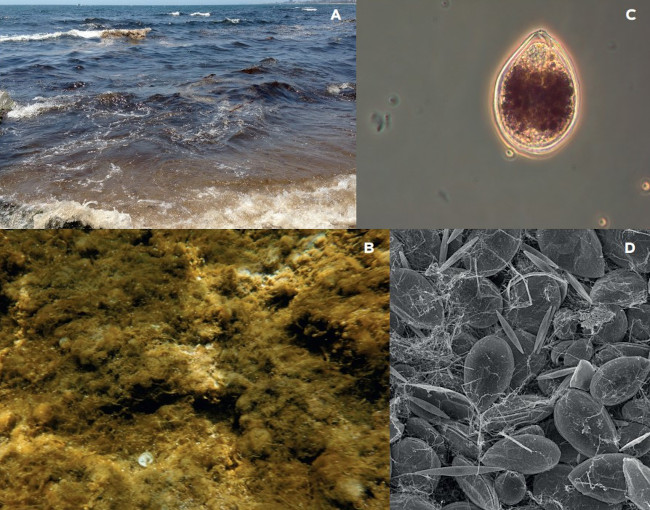 Until a few years ago, it was not common to find benthic dinoflagellates of the genus Ostreopsis in the waters of the Mediterranean; this species is more typical in tropical areas. The increase in sea temperature appears to have caused these species to settle a new location. The pictures show: A) water colouration in a shallow beach covered by a proliferation of the benthic dinoflagellate Ostreopsis; B) state of a shallow seabed covered in an Ostreopsis bloom; C)Ostreopsis cell through an optical microscope; D) the appearance of a benthic proliferation dominated by Ostreopsis under a Scanning Electron Microscope (SEM): the network of filaments secreted by the cells can be seen.