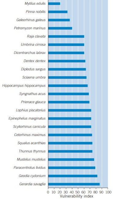 Mediterranean species with bioactive potential classified as vulnerable and ordered according to their vulnerability index, based on a study carried out in the Natural Park of Cap de Creus by Carreño and Lloret (in press). Species classified as vulnerable according to the criteria established in the methodology of this article, but with no information on their vulnerability index, are not included in the figure, but include Spongia officinalis, Axinella verrucosa, aplysina cavernicola, Spongia agaricina, Dasyatis pastinaca, Axinella polypoides, Hippospongia communis, and Sarcotragus foetidus.