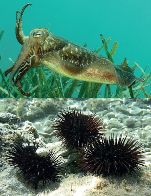 There are several animal species that produce compounds with bioactive potential in the Mediterranean Sea including molluscs such as cuttlefish (Sepia officinalis), with antibacterial potential (on the left), or echinoderms such as the sea urchins (Paracentrotus lividus), with anti-inflammatory potential (on the right).