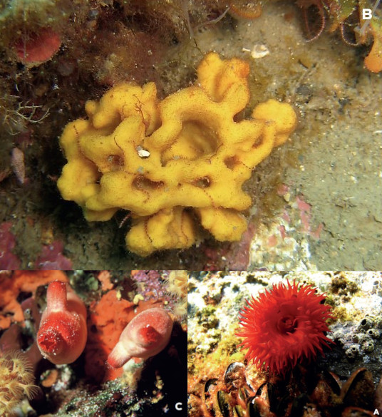 Some plant species in the Mediterranean are potential sources of molecules with pharmacological properties that could be used to research new drugs. Most are sessile, benthic organisms like the ones in the pictures: A) the cnidarian Actinia equina, with anti-inflammatory potential; B) the sponge Axinella damicornis, with antibacterial potential; or C) the tunicate Halocynthia papillosa, with anti-tumoural potential.