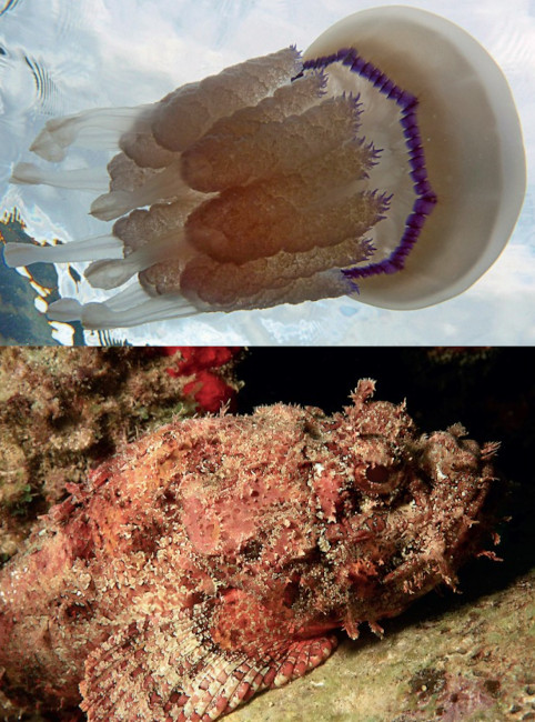 An increase in sea temperature can provide opportunities to thermophilic species that may also produce compounds with bioactive potential. This is the case of jellyfish like Rhizostoma pulmo (top), with cytotoxic potential, or Scorpaena plumieri, (bottom), with inflammatory and cytotoxic bioactive compounds.