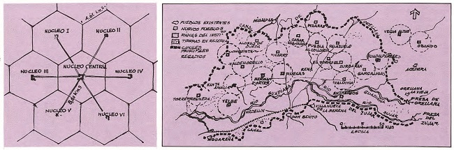 Diagrams of the National Institute of Colonisation for the Badajoz Plan, in which Christaller’s geometric ideas can be observed. On the left, the image shows the theoretical structure for rural settlement in a large irrigated area for 25,000 people. On the right, a land management diagram for part of the region of Las Vegas Altas del Guadiana, in Badajoz (Spain) is shown. In total, 45 new villages were created in the Extremaduran basin of the Guadiana River between the 1950s and 1970s.