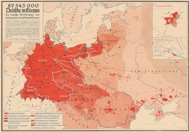 Map created by the Nazi cartographer Arnold Hillen-Ziegfeld in 1938 to prove the existence of 87,545,000 Germanic-origin inhabitants in Central and Eastern Europe. The different shades of red correspond to different «Germanic» population densities in East and Northwest Europe. The arrows indicate the spread of German municipal rights in the Middle Ages. These maps were conveniently used by Nazi propagandists to visually explain the need to expand Germany’s living space towards the east.