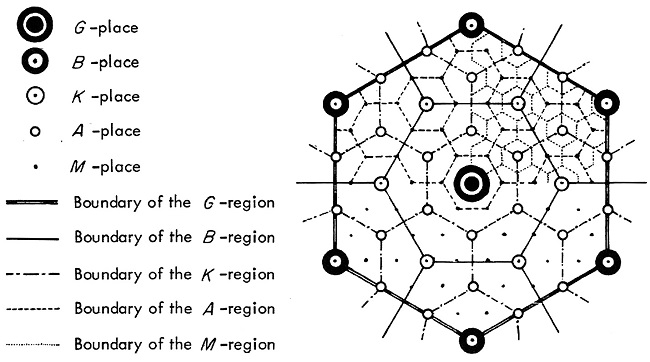 Ideal structure according to Walter Christaller’s central place theory, 1933. The image shows five ranges of centrality among communities, depending on how specialised the goods and services they provide are, and the five boundaries of their areas of influence, or associated market regions (Boundary of the G-region, etc.). Thus, the G community (G-place) corresponds to the maximum range of centrality and market influence, by offering a wider range of services.