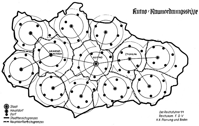 Specifically, Christaller thought that 36 new Hauptdörfer or «new villages» would have to be built in Warthegau (Barnes, 2015, pp. 197–198), which was considered the first territorial laboratory for putting his theories into practice. He distanced the settlements sufficiently from each other that their functional socio-economic areas-of-influence would not overlap, but close enough that farmers could access them within an hour; i.e., around four kilometres distance. He projected them especially in the eastern half of the region because, unlike the western half which had already formed part of the nineteenth-century Kingdom of Prussia, the SS considered that area to be less historically germanised (Fehl, 1992, p. 101).