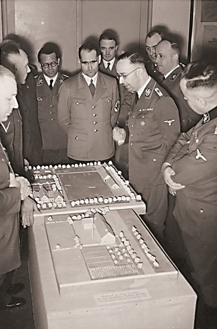 Opening of the exhibition «Planning and Construction in the East» in Berlin on 20 March 1941. In the centre, opposite Konrad Meyer, Heinrich Himmler shows Rudolf Hess, among others, the model of an ideal rural settlement in the east.