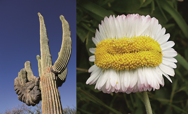 Cancer-like phenomena are observed across the diversity of life. Plants may be better than animals in coping with the uncontrolled growth of their cells, as a result of their cell walls and modularity. Due to this, they stand to prove pervasiveness of cancer-like phenomena, as seen here in these specimens of saguaro (left) and daisy (right), both with an abnormal growth (also known as fasciation in plants).