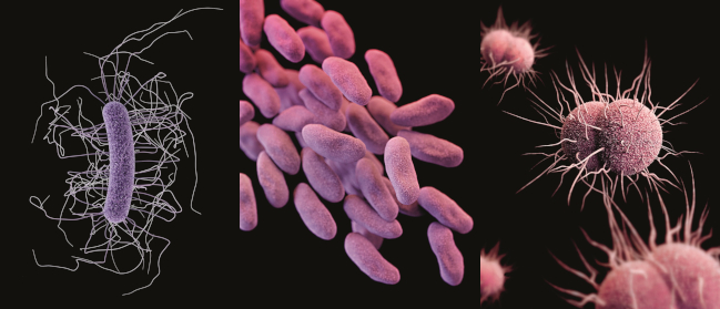 In 2013, the Center for Disease Control and Prevention (CDC) released a report cataloguing the main threats to public health caused by antibiotic-resistant pathogens of clinical interest (CDC, 2013). The picture shows 3D renderings of the structure of three bacteria classified as «urgent threats» in the report (from left to right): Clostridium difficile (which causes life-threatening diarrhoea and colitis); Clones pertaining to the Enterobacteriaceae family, resistant to carbapenem antibiotics, and Neisseria gonorrhoeae antibiotic-resistant strains (the bacterium responsible for gonorrhoea).