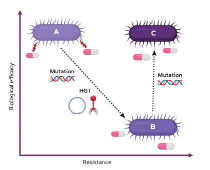Diagram of the evolution of bacterial antibiotic resistance. An antibiotic-sensitive bacterium (A) evolves a resistance thanks to chromosomal mutations or horizontal gene transfer (HGT). The resistance mechanism imposes a biological cost or a reduction in biological efficacy (B), which is corrected through compensatory mutations (C).