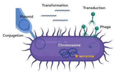 Diagram of the bacterial antibiotic resistance acquisition mechanisms. As shown in Figure 2, bacteria can become resistant to antibiotics through chromosomal mutations or horizontal gene transfer (HGT). The picture shows the main HGT pathways: conjugation (direct plasmid transfer between bacteria), transformation (DNA capture from the environment), and transduction (bacteriophage-mediated DNA transfer).