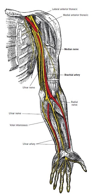 Layout of the main upper-limb peripheral nerves and blood vessels in Homo sapiens. The brachial artery and the median nerve are highlighted.