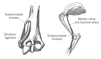 Normally, the process is associated with a fibrous ligament known as Struthers’s ligament (Figure 2, left drawing) in honour of its discoverer, John Struthers (Struthers, 1848). This ligament inserts at the far end of the bone and runs to the medial epicondyle of the humerus and forms an arc through which the median nerve runs, usually accompanied by the brachial artery and sometimes also by the ulnar or radial artery. The presence of the median nerve and/or vessels in this supracondylar arch leads to their compression by Struthers’s ligament.