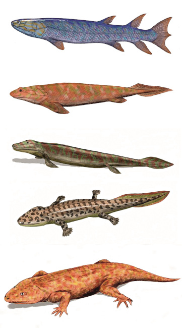 The first tetrapods, that is, the group of vertebrates that ventured onto the land surfaces characteristic of the terrestrial environment in the upper Devonian period (≈ 385–359 million years ago), evolved from sarcopterygian fish including coelacanths. This group of fish is characterised by its lobed and fleshy fins and skeletal elements resembling those of the extremities of the first tetrapods. Specifically, a group of these sarcopterygian fish (see Tiktaalik roseae in Figure 3) are considered a transitional form between fish and true tetrapods.