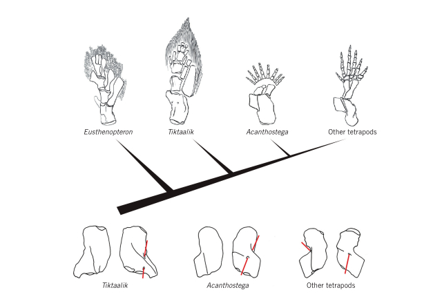Nobu TamuraOrigin of the entepicondylar foramen and humeral torsion in basal tetrapods. The top image shows a cladogram of some basal tetrapods and tetrapodomorphic fish, showing their pectoral fins. The bottom image shows a dorsal (left) and ventral (right) view of the humerus for the indicated taxa, showing the entepicondylar (foramen) channel with the path (in red) followed by the median nerve and brachial artery.