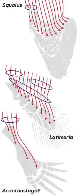 Origin of the brachial plexus as an evolutionary innovation in tetrapods. The image at the top shows the pectoral fin of an elasmobranch fish, showing the nerves (red arrows) and some anastomosis – the loose union of nerves – (circled). In the centre, pectoral fin of a lobed-fin sarcopterygian fish with extensive anastomosis. The image at the bottom shows the innervation pattern of a basal tetrapod (here hypothetically representing Acanthostega) which shows the appearance of the brachial plexus and its distal and proximal branching (see text for more detail).