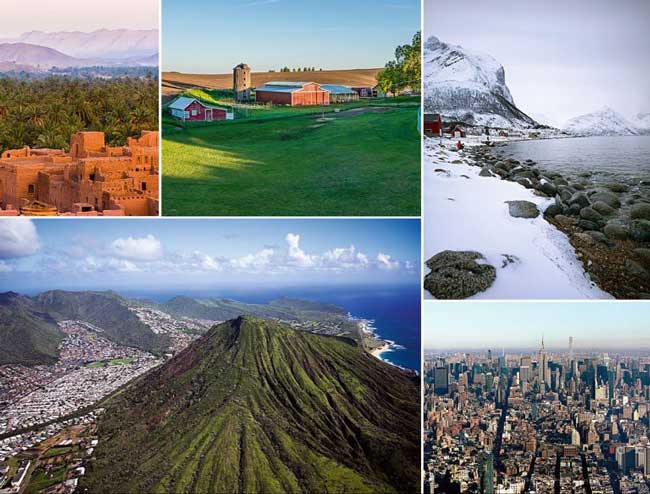 Cultural evolution has allowed humans to adapt to environments with very different characteristics. From left to right and from top to bottom, the pictures show a view of Tamnougalt at the Draa River valley in Morocco; a farm in Washington, USA; a seaside town in Norway; an aerial photograph of Honolulu in Hawaii, USA; and a view of New York city, USA.