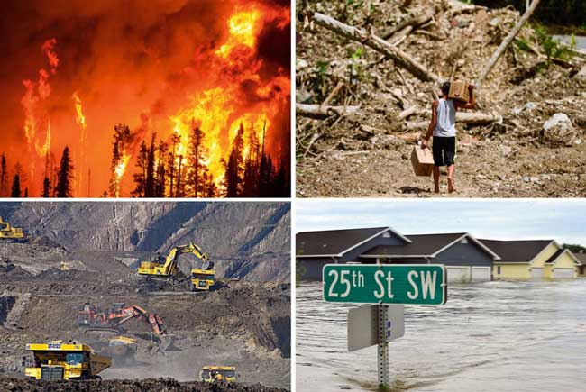 From an environmental perspective, the main environmental challenge would be to reverse phenomena such as climate change. From left to right and from top to bottom, a wildfire in Idaho (USA) in summer 2016; the consequences of hurricane Maria in Puerto Rico in 2017; a coal extraction operation in Indonesia; and flooding in North Dakota (USA) in 2011.