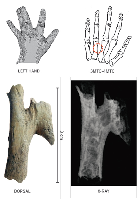 Source: Grupo Paleolab®In addition, tumoural or neoplastic pathologies had a low prevalence (5 %–9 %), and were mostly benign cranial tumours, although two cases compatible with malignant tumours were recorded (one nasal and the other with a possible haematological cause). The prevalence of congenital pathologies was even lower (< 5 %). For example, the find of a republican child aged under six years with complex metacarpal bone syndactyly was striking (Figure 9) and suggests a possible association with a polymalformative disorder linked to mental retardation (possibly Down syndrome).