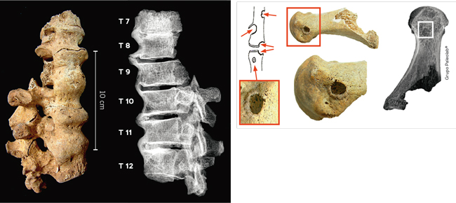 Source: Grupo Paleolab®Infectious pyogenic diseases such as sinusitis and otitis had a low prevalence (2 %–6 %), while signs of osteitis by parasitosis were documented in 10 %–15 % of the sample. In contrast, widespread infectious diseases related to long-bone periostitis were much more prevalent (23.1 %), especially those compatible with bone tuberculosis (Pott’s disease; 5 %–12 %; Figure 8), pulmonary and pleural tuberculosis (25.35 %), brucellosis (3.70 %), or other pulmonary pathologies more or less directly related to exogenous environmental and public health factors. These findings would confirm the introduction of tuberculosis and other infectious diseases by the colonial military detachment (Polo-Cerdá, García-Prósper, Guérin, & Villalaín, 2004), as well as the reintroduction of new cases during the repopulation in the first century AD.