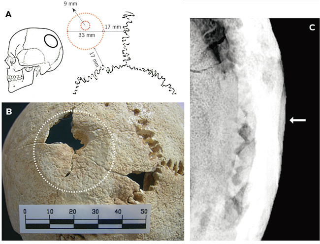 A 20–25-year-old male from the first century AD who underwent trepanation with a 9 mm drilled hole in the left parietal cranial bone (images A and B); C shows the X-ray of the injury. The individual survived the procedure, which may have been carried out for therapeutic and ritual purposes.
