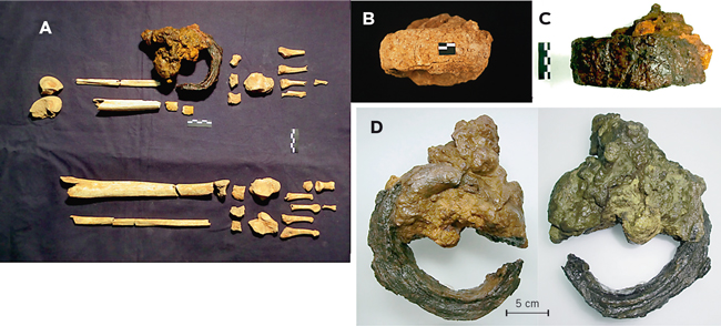 Skeletal remains of a slave/captive in Valentia in the first century AD. Picture A shows the preserved bone remains. B shows the oxidised iron shackle before restoration. C shows the restored shackle, and D shows its front and back.