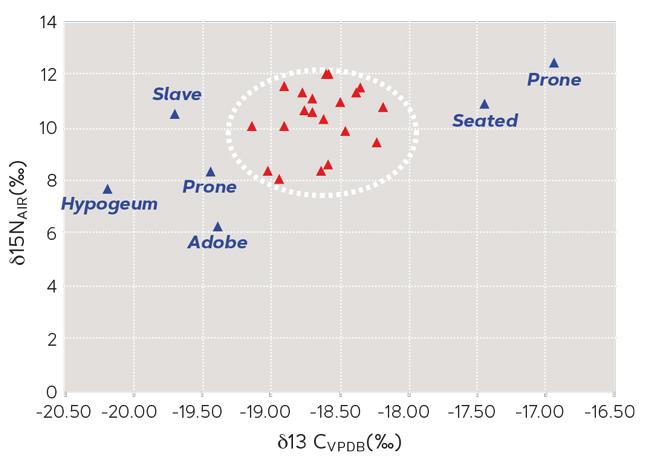 Isotopic results have made it possible to profile intra- and inter-group food variability according to certain social stratification indicators (such as the use of hypogea versus simple pits). During the imperial period, individuals belonging to disadvantaged social groups (the slave/captives and those buried in a prone or anomalous position), had different isotopic values, especially with respect to the general population (simple graves), but not compared to the hypogea of the previous phase (Figure 12).