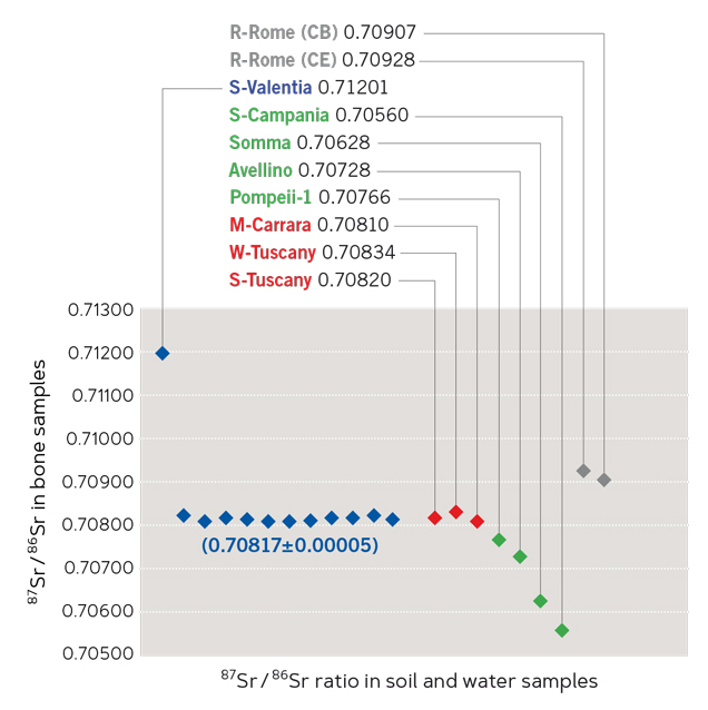 Beyond the information provided by classical sources, complementary techniques can help us to understand the mobility and origin of ancient populations. For example, strontium isotope (87Sr/86Sr) analysis can contribute new information. Its importance lies in the fact that the isotopic relationship in the bones and teeth of an individual corresponds to the values of the plants, animals, and water they consumed, and also correlates with the isotopes in the soil of a geological region. Because tooth enamel does not regenerate or incorporate new material after its formation, isotopes closely reflect the geological region that person inhabited when the enamel was formed. Bones, on the other hand, are in constant regeneration and show isotopic values that reflect the region in which the individual lived just before their death.