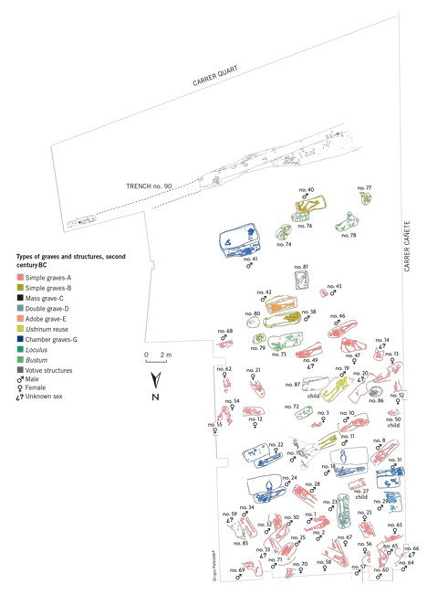 The archaeological work carried out over five campaigns between 1996 and 2000 on a 531.85 m. site, resulted in the discovery of 248 tombs representing both burial ritual types (inhumatio and crematio). A total of 179 burial tombs containing 190 skeletons, and 69 cremation tombs accommodating 61 individuals were documented. The stratigraphic sequence of the cemetery space is distributed into three funerary horizons that span from the moment of its foundation in the last third of the second century BC, until the third century AD. The funerary evolution coincides with the memory and pulse of the main historical episodes lived in the city.