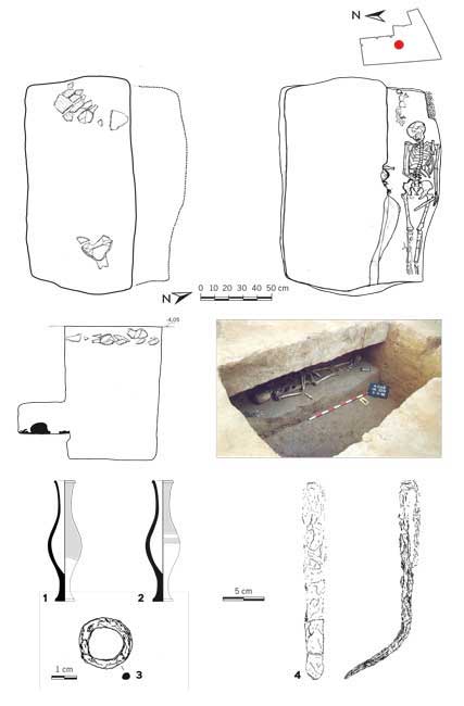 This is one of six graves of this type documented in the foundational phase of the Roman necropolis on Carrer Quart in Valencia. Funerary objects include unguent jars (1, 2), a ring (3) and strigiles (4).