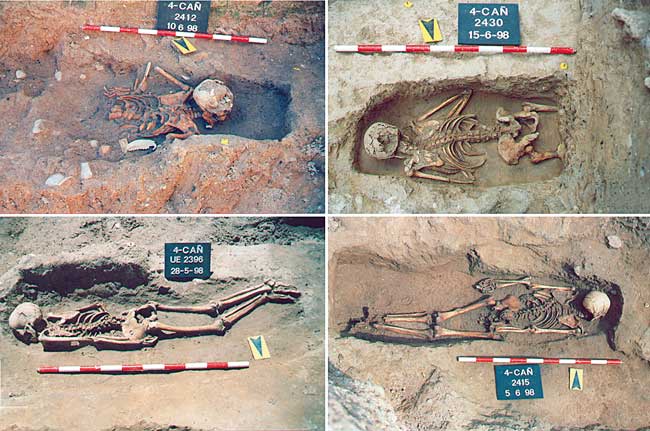 Tombs of the foundational period of Valentia with individuals buried in anomalous positions; i.e., without a pattern in the positioning of the corpse. In the image on the left, the individual exhibited a forced hyperflexed lower-limb posture, while the image on the right exhibited a forced seated posture. The possible explanation for these cases is that these individuals suffered from tuberculosis.