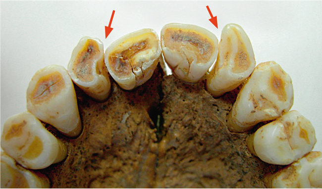 Source: Grupo Paleolab®The picture shows the Etruscan tooth or Etruscan upper lateral incisor in an individual from Republican Valentia (second century BC) showing the curvature of the mesial face. This phenotypic expression, which was present in 19.05 % of the colonial population of Valentia, reinforces the hypothesis that the population had a Roman-Italian origin with a strong Hellenistic influence, such as the one around Etruria.