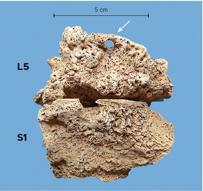 Advanced bone tuberculosis (Pott’s disease) in a skeleton from imperial Valentia. Note the pronounced infection of vertebrae L5 and S1, which were virtually unrecognisable and had two fistulised purulent cavities.