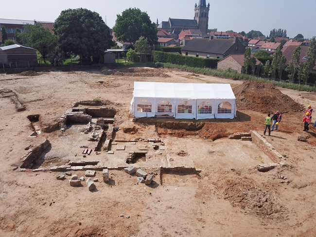 Many excavations to rescue structures, human remains, and objects related to World War I have resulted from accidental discoveries or preventive measures before building development on a site. This is the case, for example, with the Hill 80 project. In 2018, an international group of archaeologists and historians initiated an excavation at Höhe 80 (“hill 80”) near the town of Wijtschate (Belgium), which was used as a military position by the German army. This project is being completed thanks to a still active crowdfunding campaign. In the picture, aerial photograph of the largest grave found in the area, located within the area demarcated by the tent, from which eighteen German soldiers who fought in World War I were recovered.