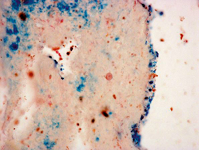 The image shows Prussian blue staining performed on brain 11. This test revealed the existence of a subarachnoid (marked in blue close to the border) and intra-parenchymatous (marked in blue in the interior) haemorrhage from at least 48 hours before death. This finding shows that brain conservation can be a gateway to investigate abuse and torture even eighty years after the original events occurred.