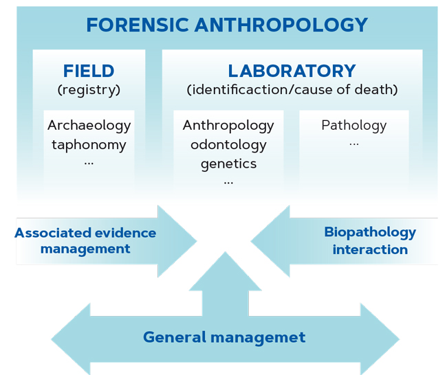 Forensic anthropology (Figure 1), with all its different definitions, currently forms a part of every other related discipline and integrates the increasingly widespread recommendation of producing a final written report to make its results understandable for each of the other specialists involved in the project. This so called «integrated report» is used in some legal medicine institutes in countries including Chile and Colombia, which has allowed remarkable progress in different forensic science disciplines. Some texts, like Recomendaciones en antropología forense (“Recommendations in forensic anthropology”), by the Spanish Association of Forensic Anthropology and Odontology, already recognise the importance of integrated reports and devote specific sections to them (Serrulla, 2013).